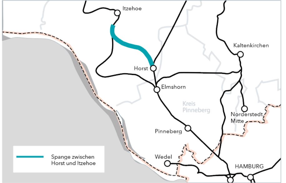 Wie die Holsteiner Allgemeine bereits am 17.01.2024 berichtete, nimmt das Projekt einer schnellen, voll elektrifizierten Bahnstrecke zwischen Hamburg und Heide mit einem sogenannten Bypass zwischen Horst und Lägerdorf konkrete Formen an. Hintergrund ist die Ansiedlung des Batterieherstellers Northvolt in Heide, der eine Verkürzung der Fahrtdauer für Arbeitskräfte aus dem Hamburger Raum wünscht, wobei die momentane Schleife über Krempe-Glückstadt zu zeitraubend ist. Der genaue Streckenverlauf ab Horst entlang der A23 ist noch nicht festgelegt.
