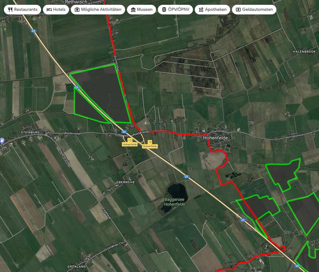 Grün umrandet sind die Flächen der geplanten Photovoltaik-Anlagen Horst und Hohenfelde (inkl. einem geringen Teil auf Rethwischer Gebiet). Rot ist die Route des historischen Ochsenwegs West, der dann auf Horster Gebiet direkt durch einen geplanten Solarpark führen soll und auf Hohenfelder Gebiet eine weite Strecke an einem geplanten Solarpark entlang. Nicht zu vergessen die hier nicht dargestellte, aber geplante A20, die dann zwischen der Hohenfelder Abwasseranlage und den Horster Solarparks verlaufen und den Ochsenweg queren wird.
